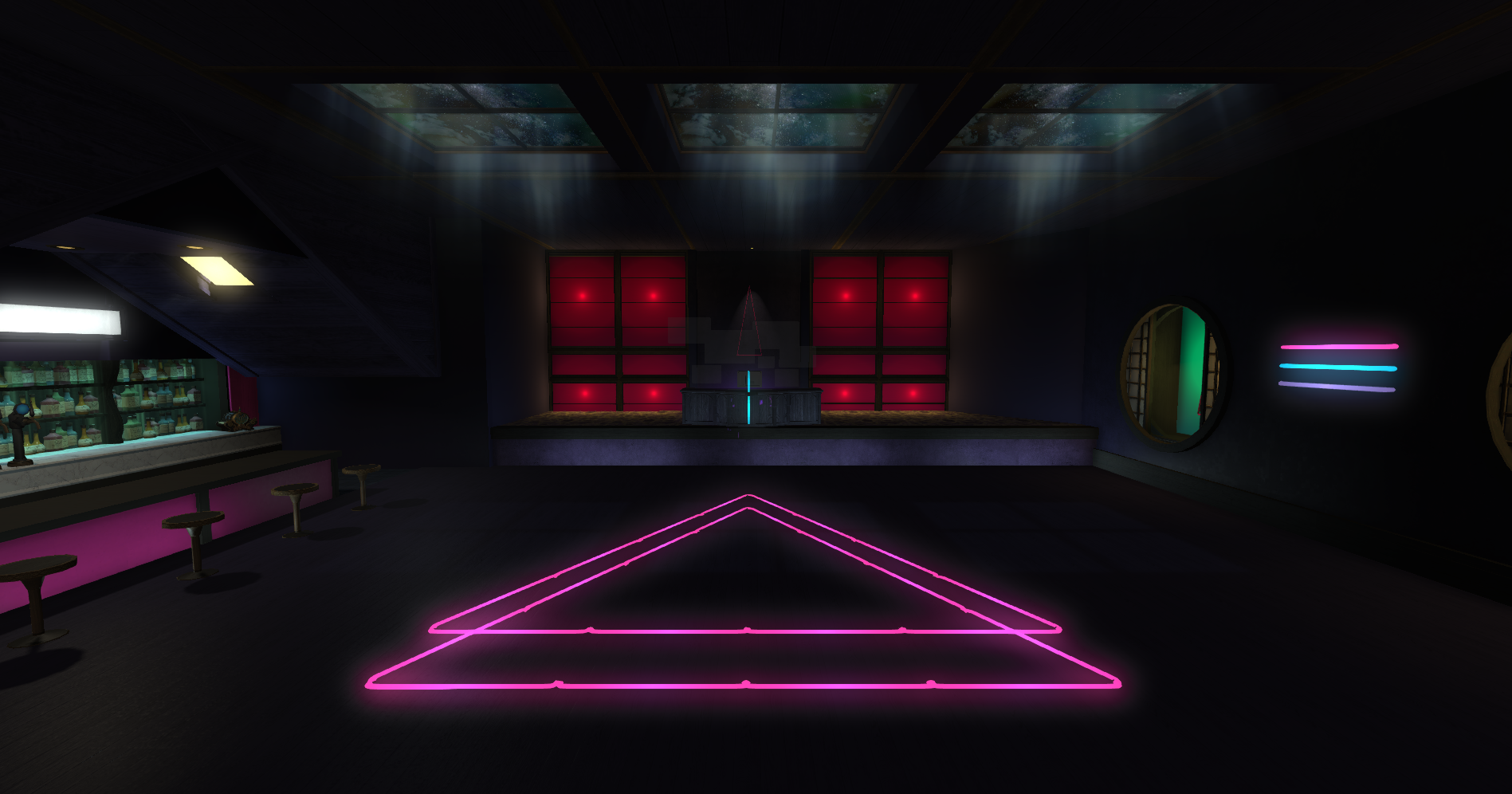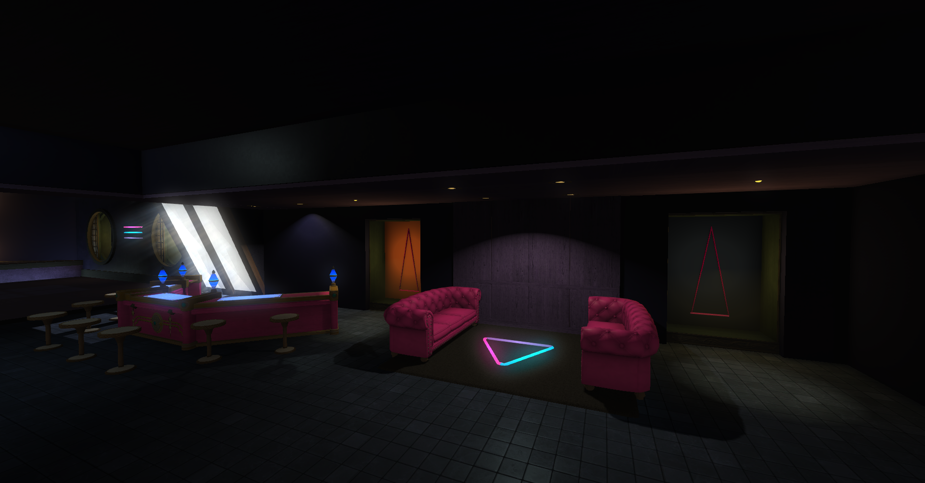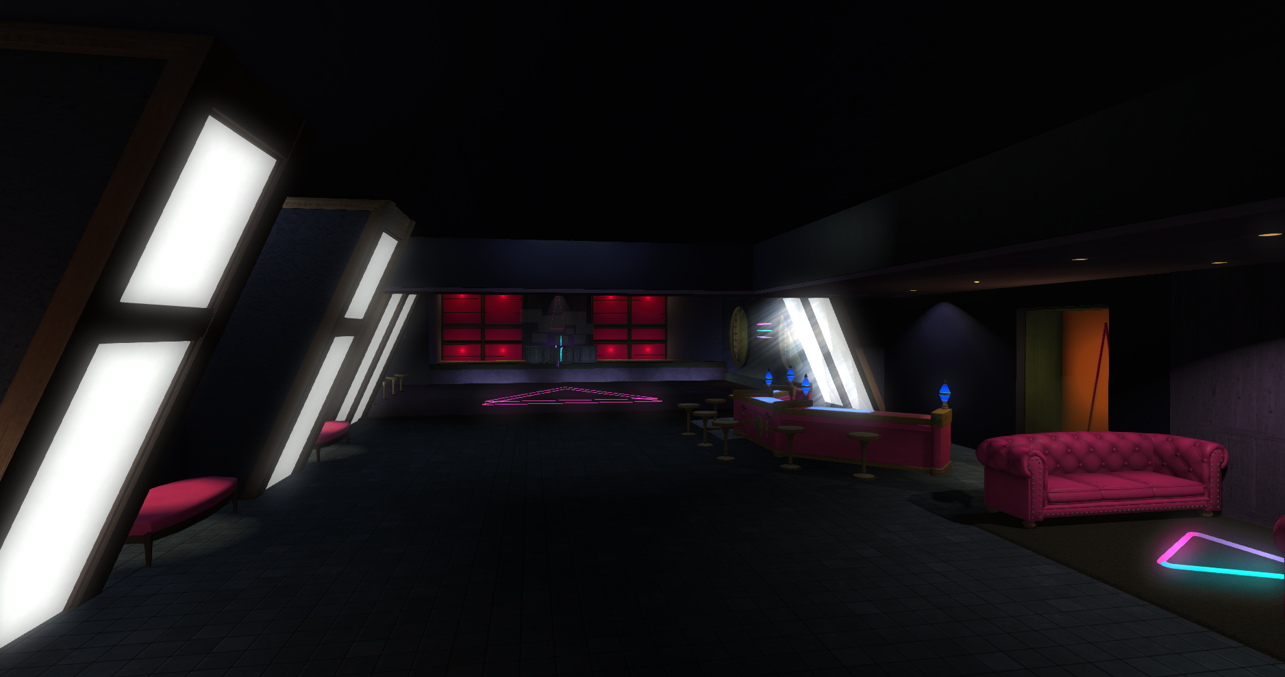 Club Trifecta leans into a cleaner, nightlife-oriented venue look with bold illumination, polished surfaces, and a stronger late-night entertainment mood across the full interior.