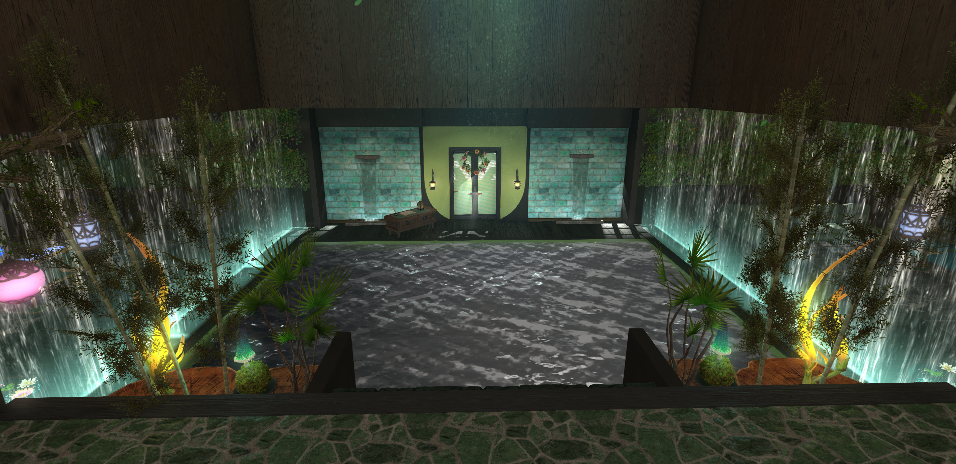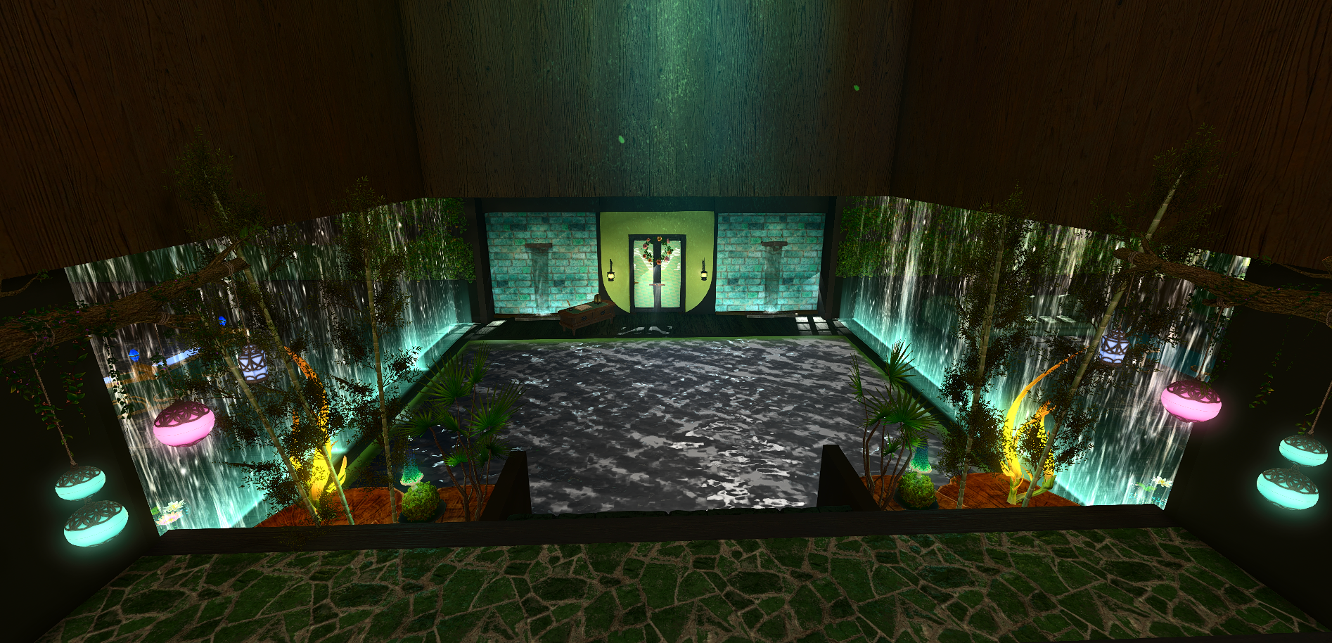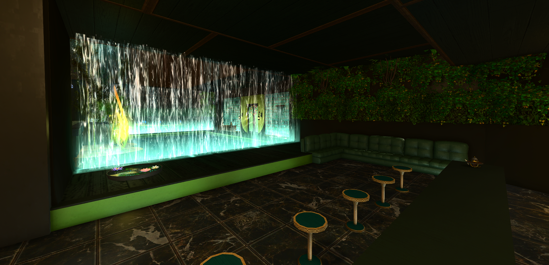 Verdant Waters Venue leans into a calmer, greener large venue identity with layered natural tones, water-inspired atmosphere, and a more immersive destination feel across the interior.