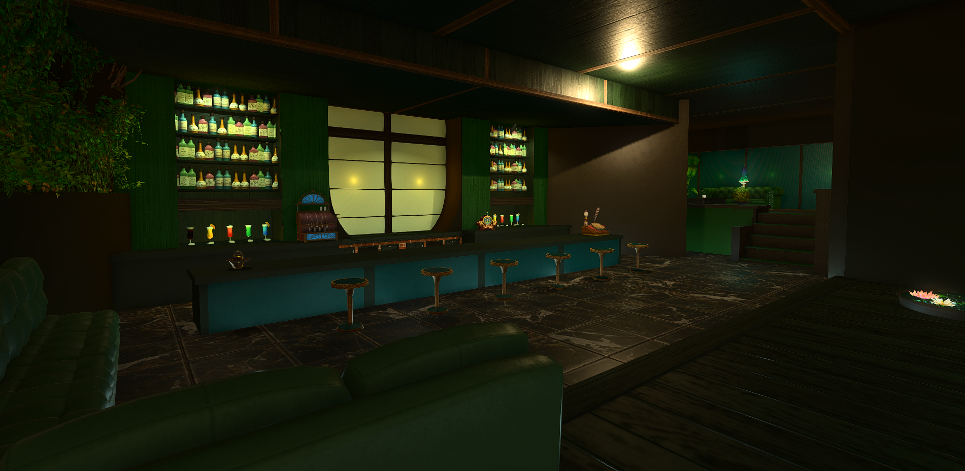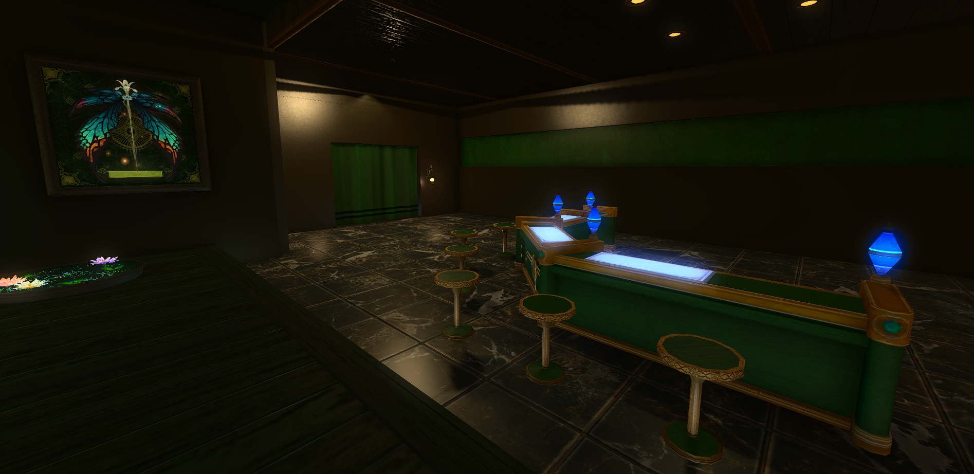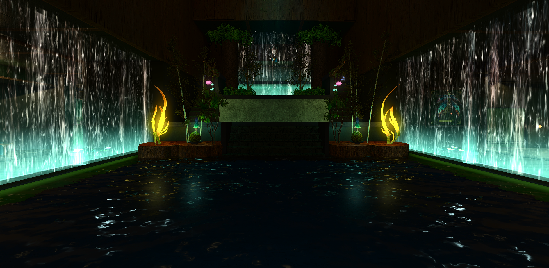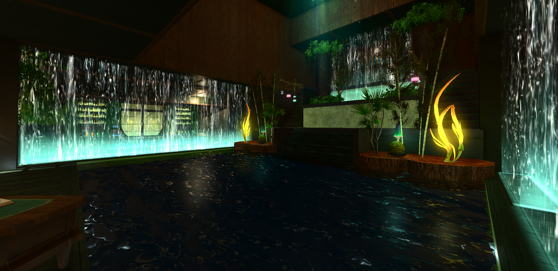 Verdant Waters Venue leans into a calmer, greener large venue identity with layered natural tones, water-inspired atmosphere, and a more immersive destination feel across the interior.